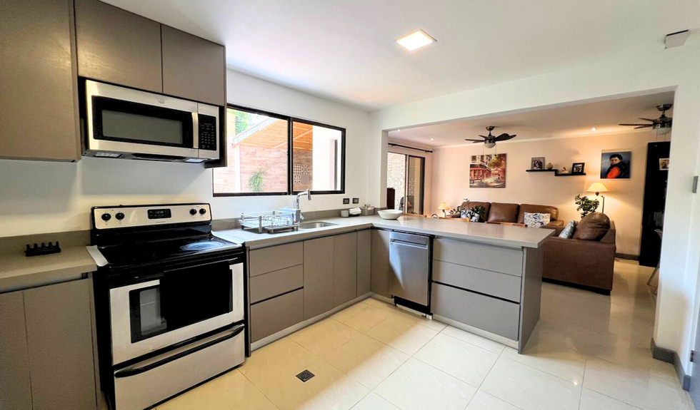 Sala, comedor y cocina con desayunador integrada